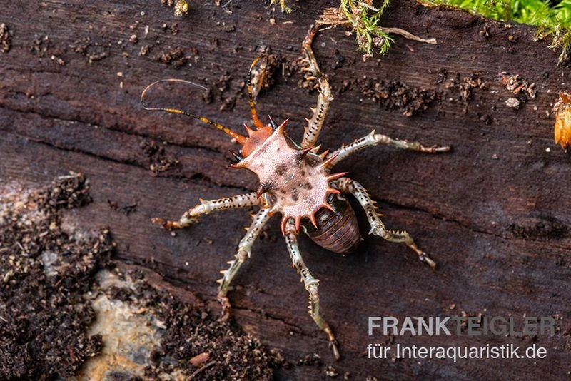 Bei der Afrikanischen Dornen-Grille, welche die wissenschaftliche Bezeichnung Cosmoderus femoralis trägt, handelt es sich um eine optisch sehr ansprechende Grillen-Art aus dem afrikanischen Raum. Die Cosmoderus femoralis ist weitestgehend in Kamerun angesiedelt. Ihren Namen verdankt die Afrikanische Dornen-Grille den zahlreichen Stacheln am Körper, welche optisch an Dornen erinnern, deshalb nennt man sie alternativ auch Drachenkopf Grille oder Kampfgrille.