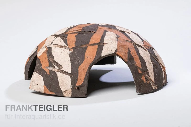 Das tönerne Axolotl Iglu von Aquariumkeramik besitzt einen Durchmesser von ungefähr Ø 25 cm bei einer Höhe von zirka 11 cm. Es verfügt über 3 Eingänge/Torbögen mit einer Größe von ungefähr 6 x 6 cm.